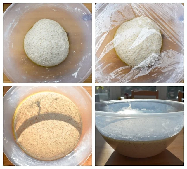 - Scrape as much of the scraps of dough left in the mixing bowl, so it is fairly clean before adding the dough back in to rise. Rub with a little oil to prevent sticking, then add the dough and cover with cling film.